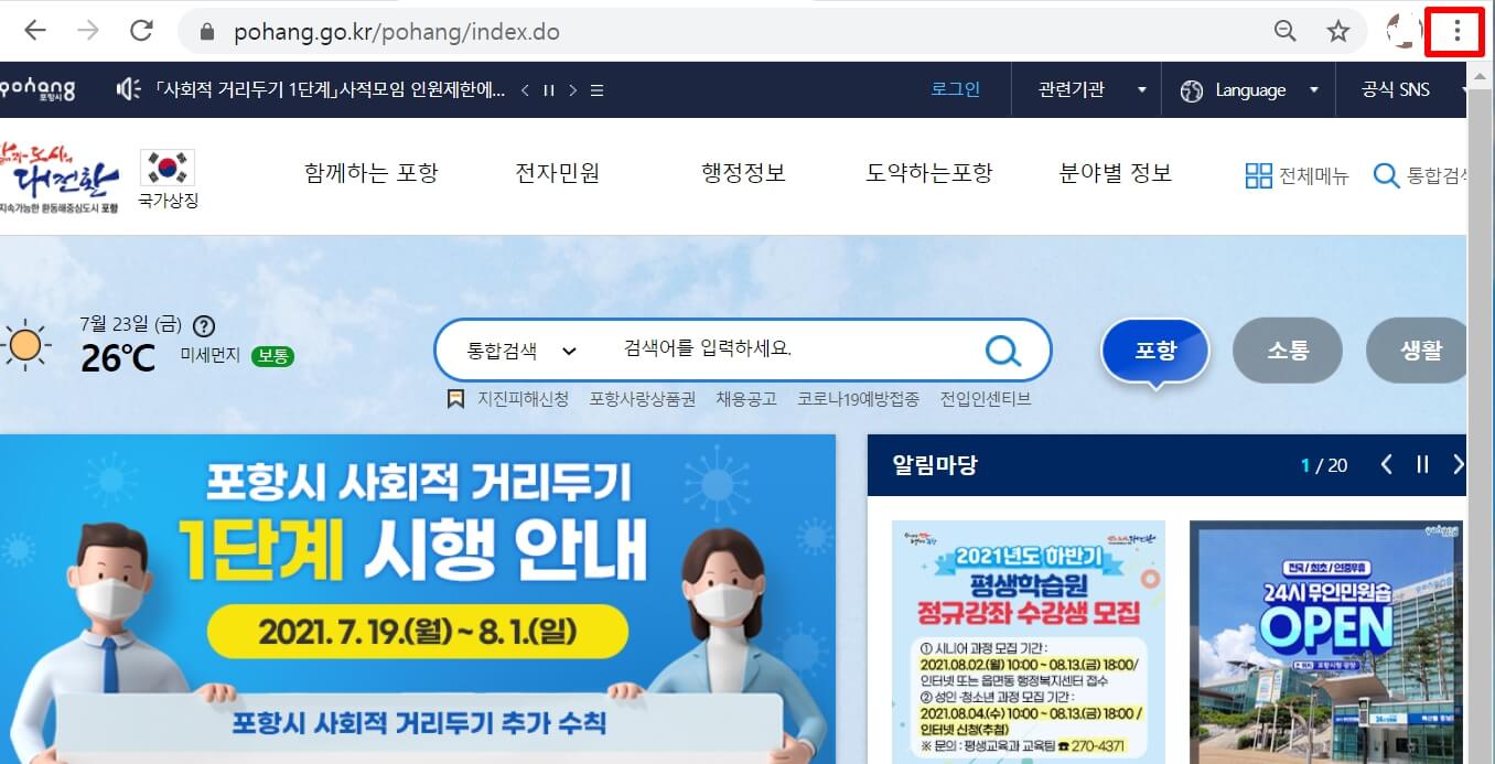 4. 포항시청 홈페이지에 들어가셔서 오른쪽 상단에 보시면 "점 3개"를 누릅니다.