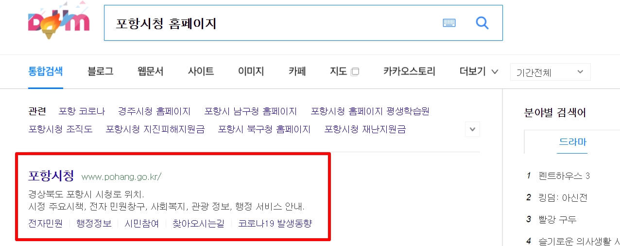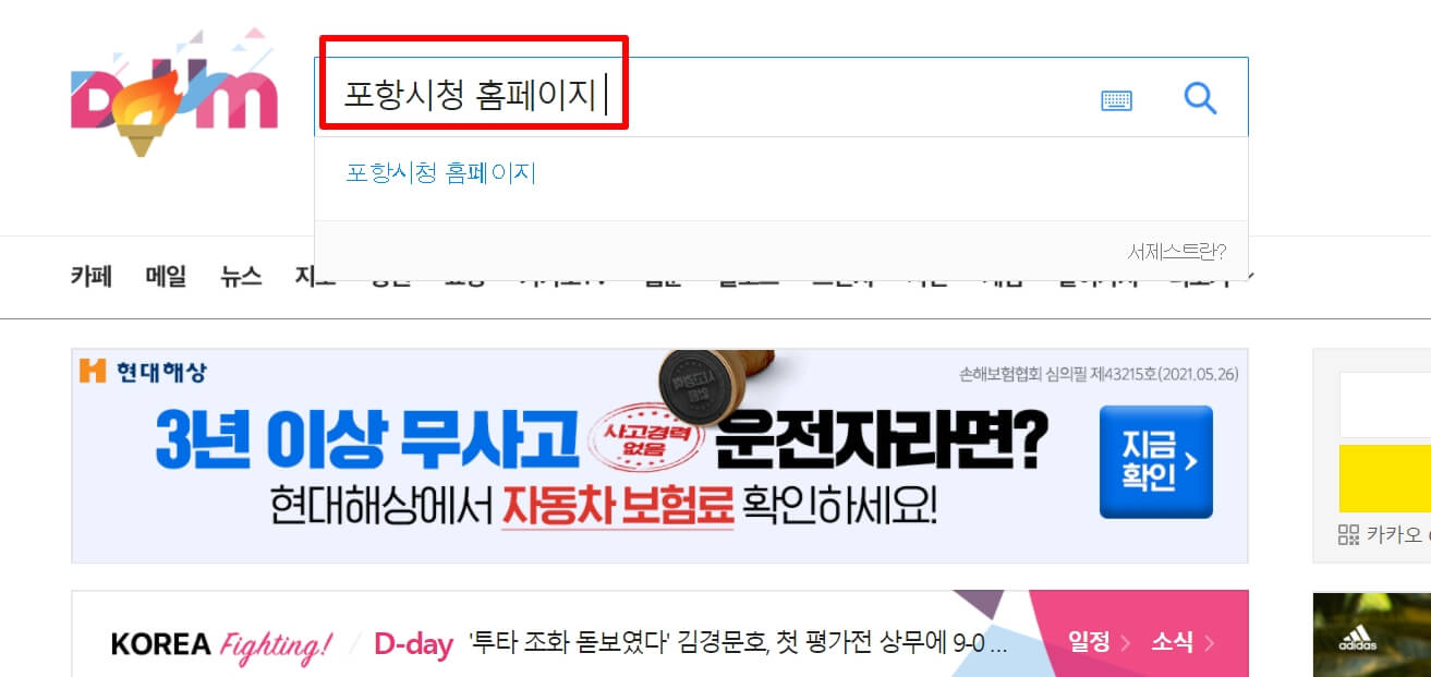 1. 다음(daum) 검색창에 "포항시청 홈페이지"라고 검색을 합니다.