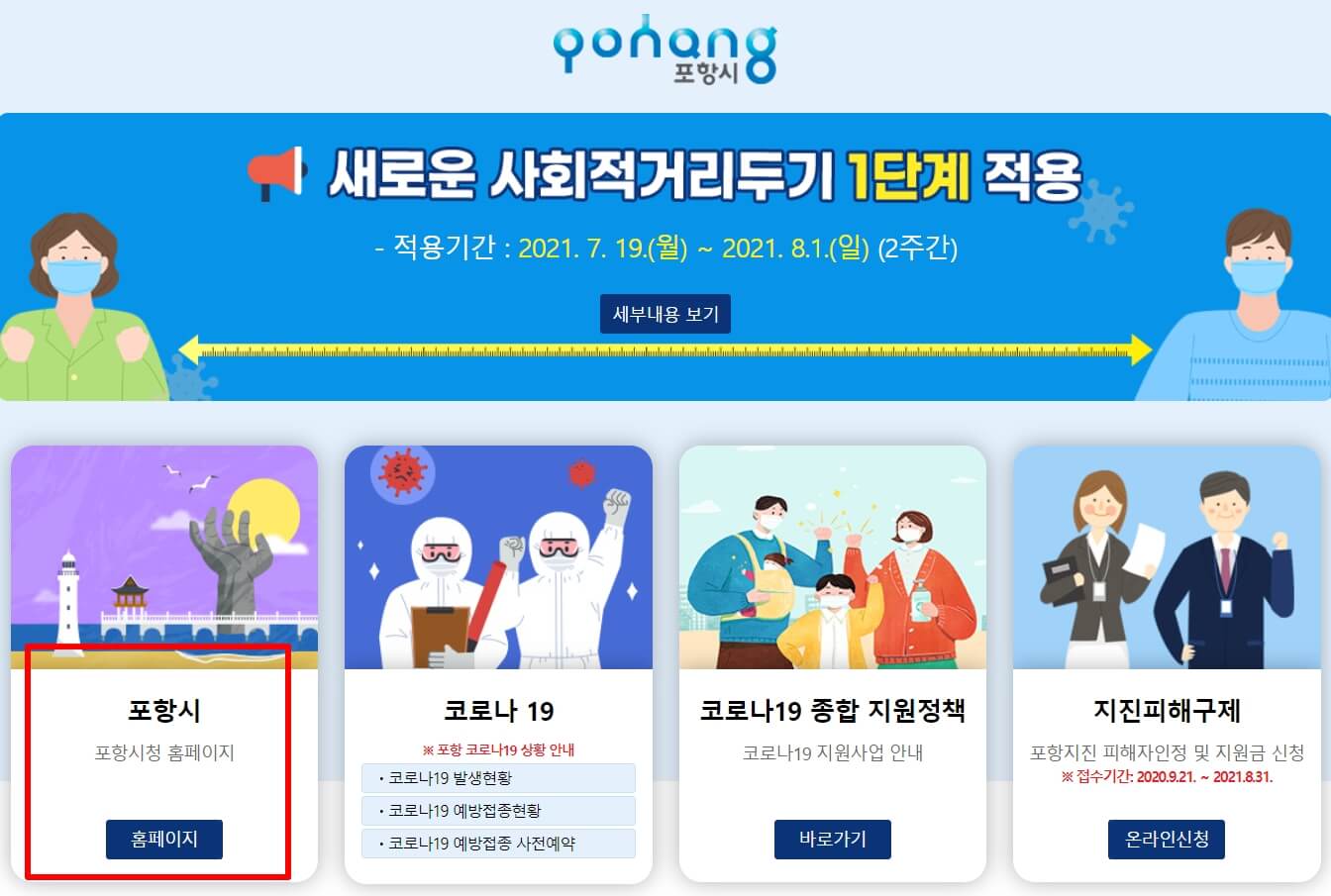 3. 포항시청을 누르셔서 접속을 하시면 포항시청 홈페이지에 바로 접속이 되지 않고, "포항시청 홈페이지 바로가기" "코로나19 현황 등" "코로나19 종합 지원정책 바로가기" "지진 피해구제 온라인 신청" 4군데가 나옵니다. 여기서 첫번째인 "포항시청 홈페이지 바로가기"를 누르셔서 포항시청 홈페이지에 접속을 합니다.
