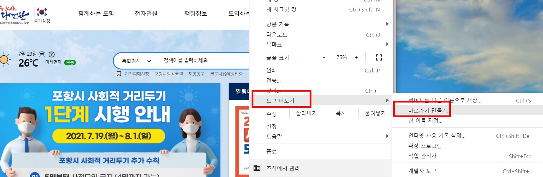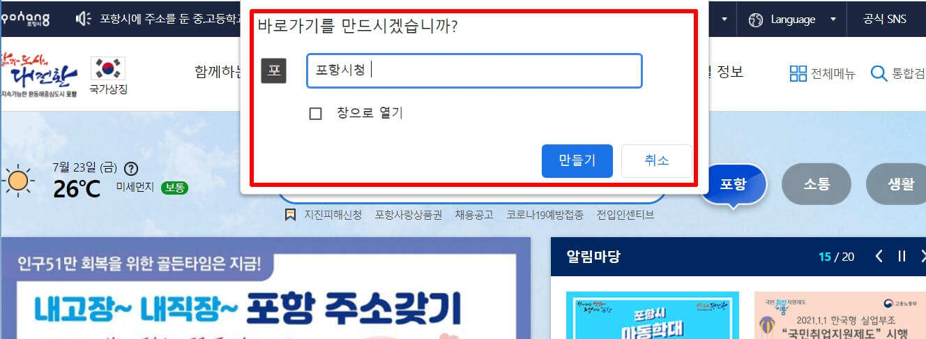 7. 바탕화면에 포항시청 아이콘이 생성이 됩니다. 포항시청 아이콘만 누르시면 포항시청 홈페이지에 바로 접속을 하실 수 있습니다. 그리고 포항시청 시정 주요 시책, 전자 민원창구, 사회복지, 관광 정보, 행정 서비스 등을 이용하실 수 있습니다.