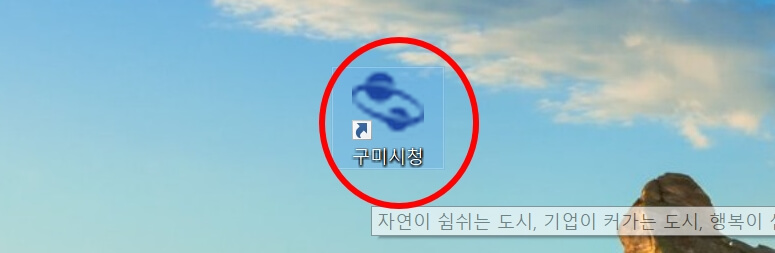 7. 바탕화면에 구미시청 아이콘이 생성이 됩니다. 구미시청 아이콘만 누르시면 구미시청 홈페이지에 바로 접속을 하실 수 있습니다. 그리고 구미시청 시정 주요 시책, 전자 민원창구, 사회복지, 관광 정보, 행정 서비스 등을 이용하실 수 있습니다.