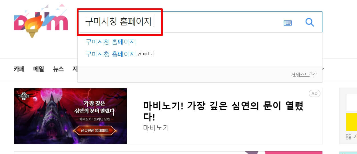 1. 다음(daum) 검색창에 "구미시청 홈페이지"라고 검색을 합니다.
