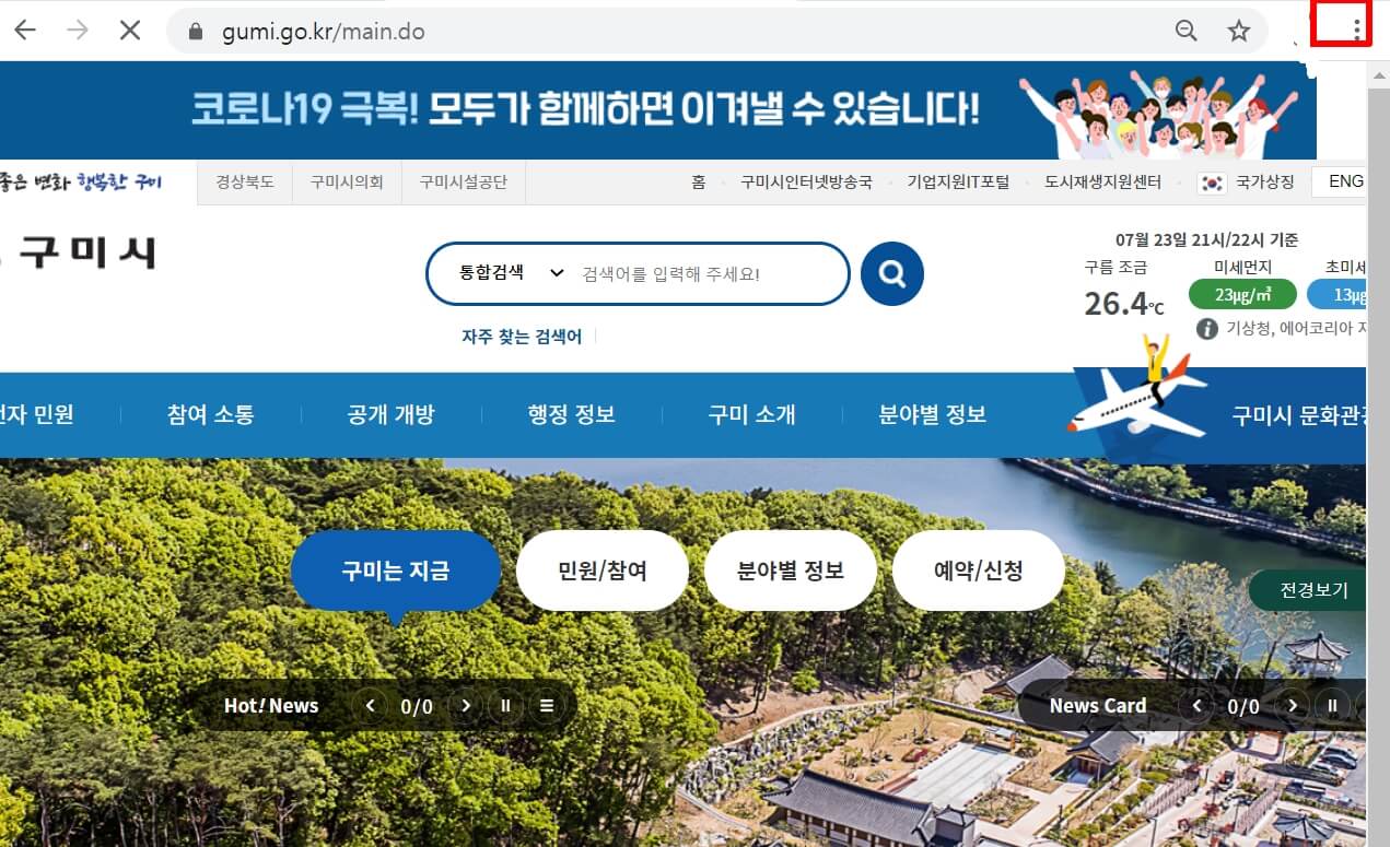 4. 구미시청 홈페이지에 들어가셔서 오른쪽 상단에 보시면 "점 3개"를 누릅니다.
