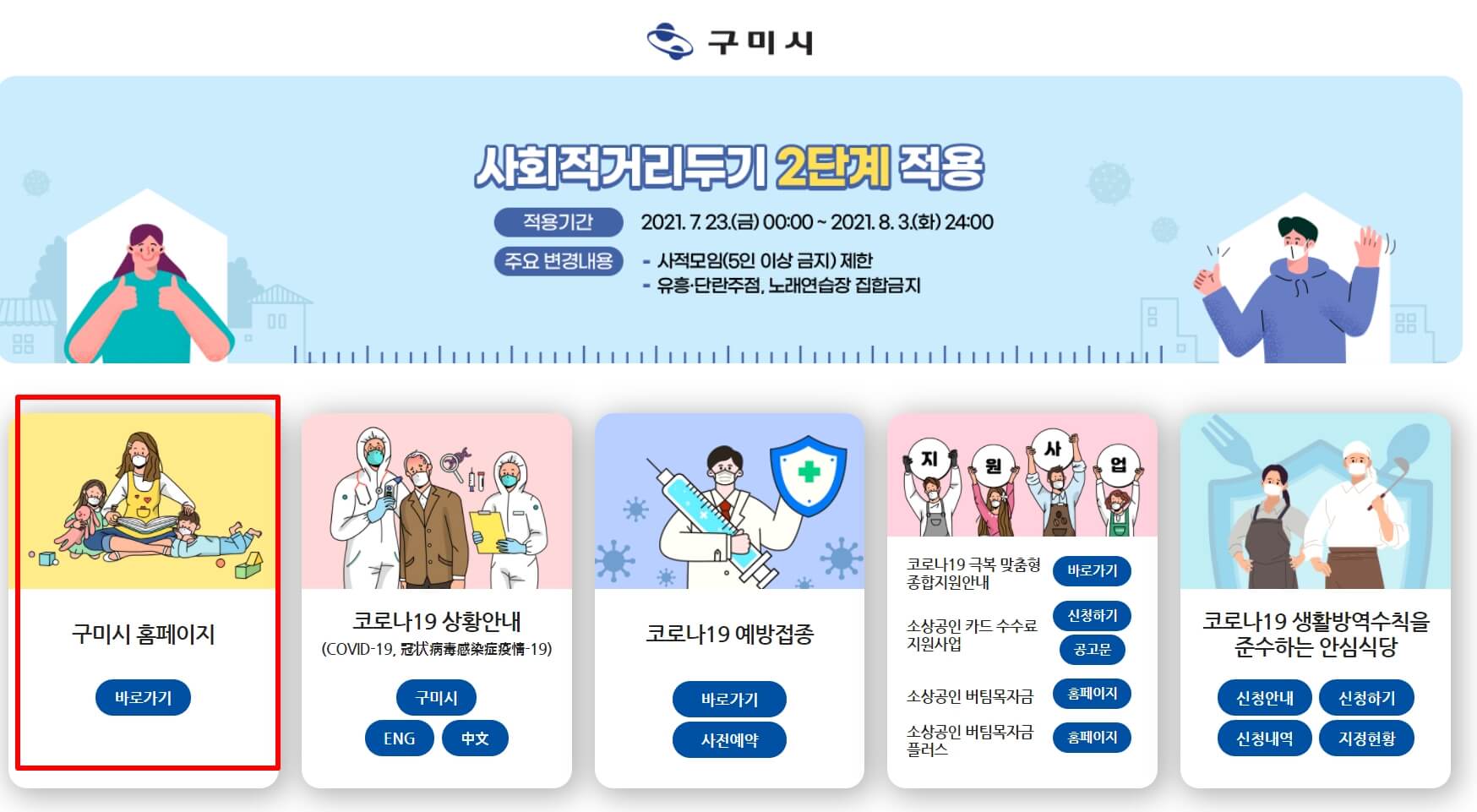 3. 구미시청을 누르셔서 접속을 하시면 구미시청 홈페이지에 바로 접속이 되지 않고, "구미시 홈페이지 바로가기" "코로나19 상황 안내" "코로나19 예방접종 바로가기, 사전예약" "코로나19 극복 맞춤형 종합지원 안내" 등 여러 가지 나옵니다. 여기서 첫번째인 "구미시 홈페이지 바로가기"를 누르려서 구미시청 홈페이지에 접속을 합니다.