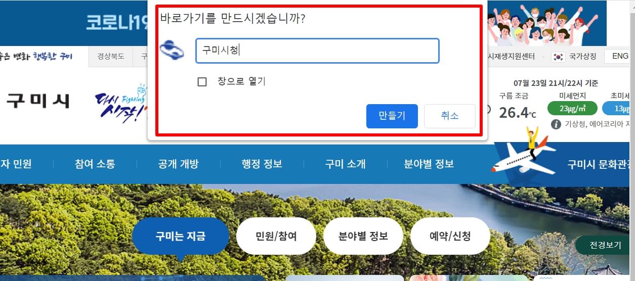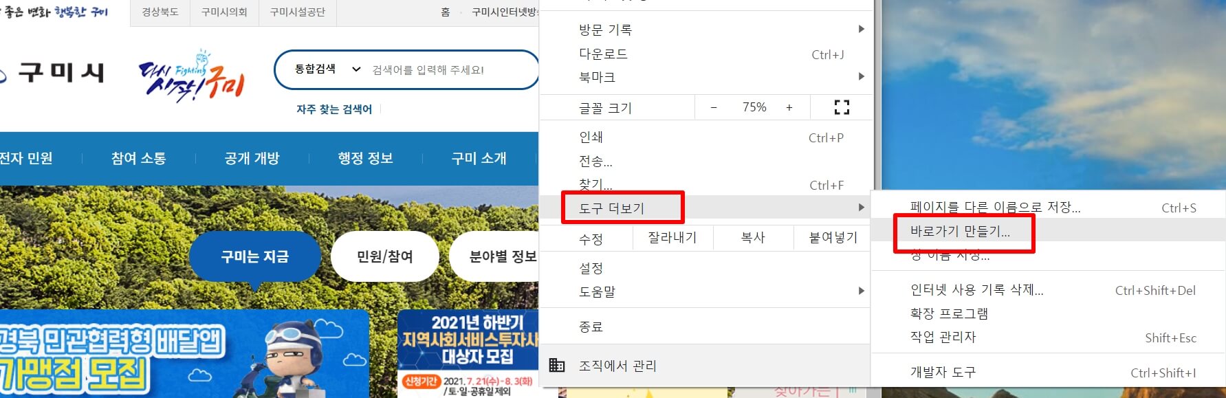 7. 바탕화면에 구미시청 아이콘이 생성이 됩니다. 구미시청 아이콘만 누르시면 구미시청 홈페이지에 바로 접속을 하실 수 있습니다. 그리고 구미시청 시정 주요 시책, 전자 민원창구, 사회복지, 관광 정보, 행정 서비스 등을 이용하실 수 있습니다.