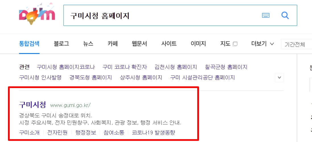 1. 다음(daum) 검색창에 "구미시청 홈페이지"라고 검색을 합니다.