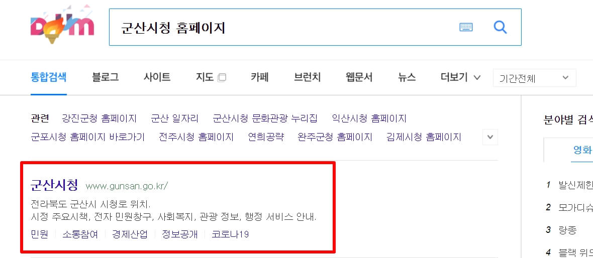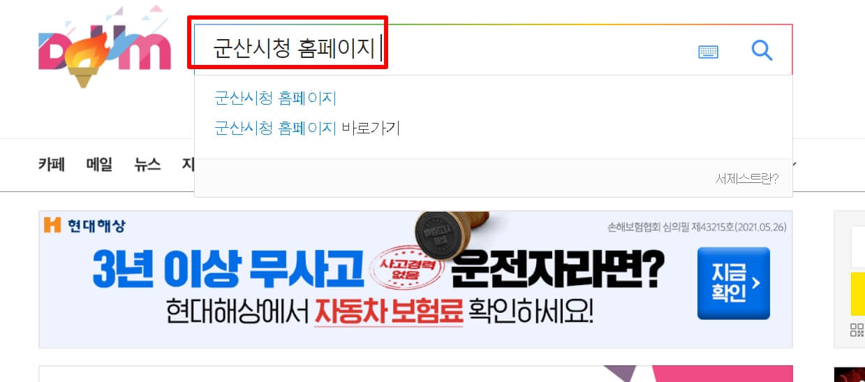 1. 다음(daum) 검색창에 "군산시청 홈페이지"라고 검색을 합니다.