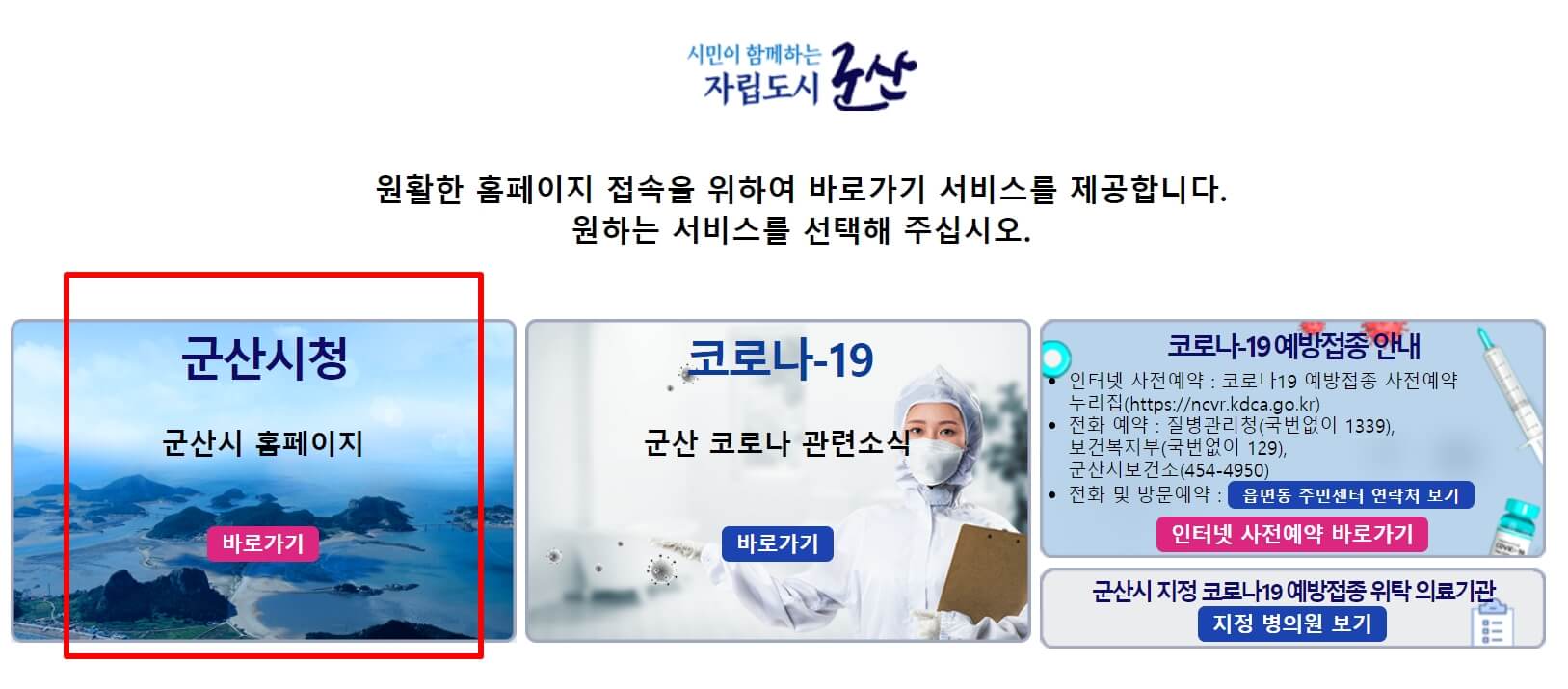 3. 군산시청을 누르셔서 접속을 하시면 군산시청 홈페이지에 바로 접속이 되지 않고, "군산시청 홈페이지 바로가기" "코로나19 바로가기" "코로나 예방접종 인터넷 사전예약 바로가기" 등 3가지가 나옵니다. 여기서 첫번째인 "군산시청 홈페이지 바로가기"를 누르셔서 군산시청 홈페이지에 접속을 합니다.