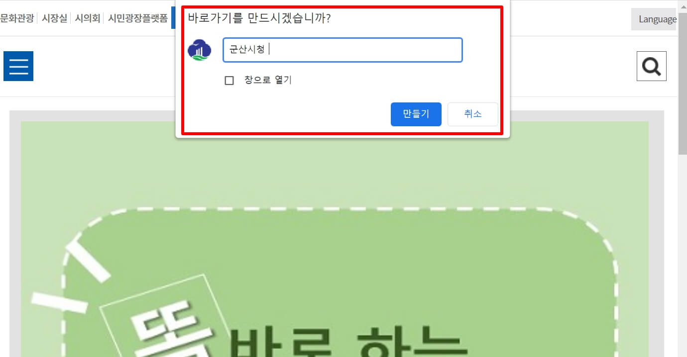 6. "바로가기를 만드시겠습니까"라고 뜨면 원하시는 이름으로 적으시고, 만들기를 누릅니다.