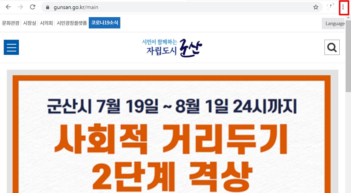 4. 군산시청 홈페이지에 들어가셔서 오른쪽 상단에 보시면 "점 3개"를 누릅니다.