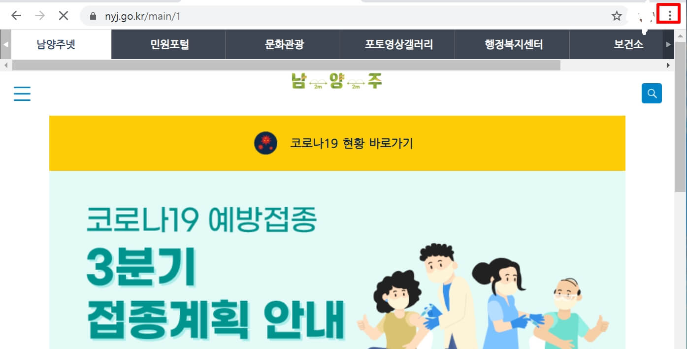 4. 남양주시청 홈페이지에 들어가셔서 오른쪽 상단에 보시면 "점 3개"를 누릅니다.