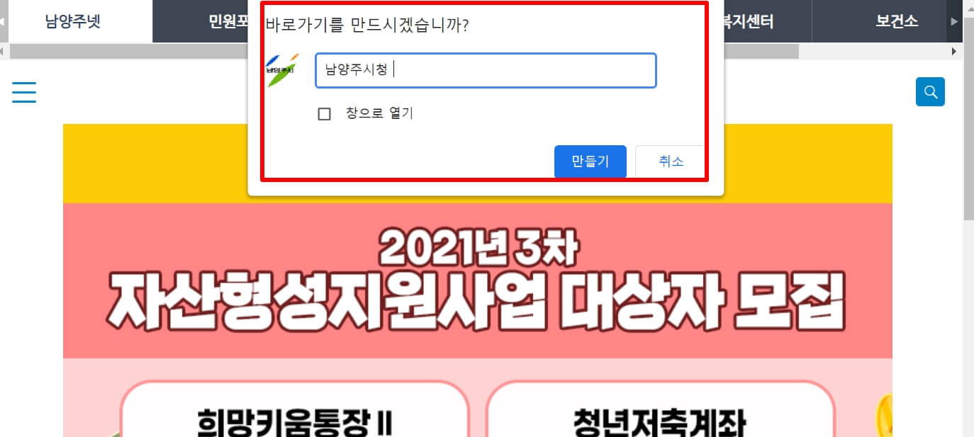 6. "바로가기를 만드시겠습니까"라고 뜨면 원하시는 이름으로 적으시고, 만들기를 누릅니다.