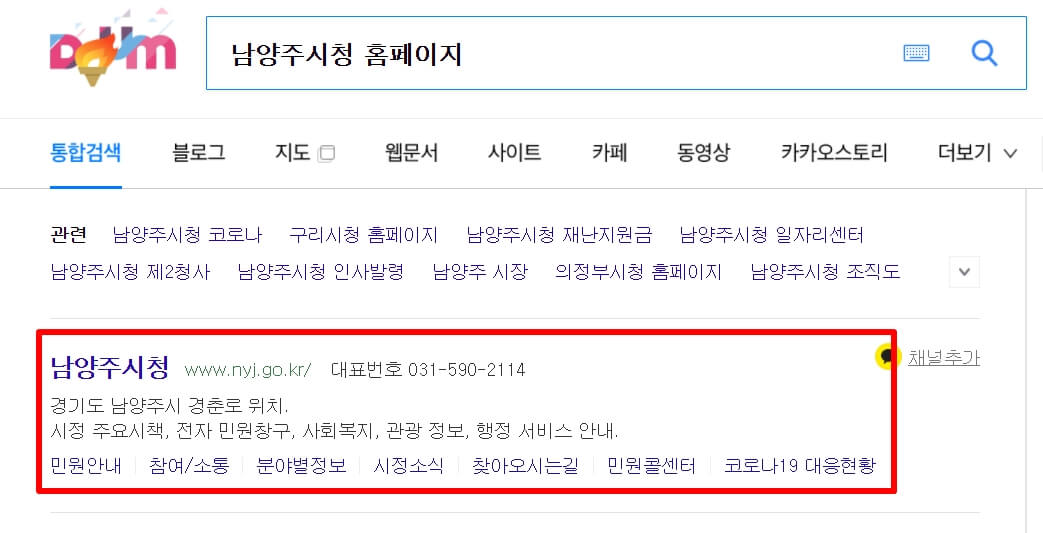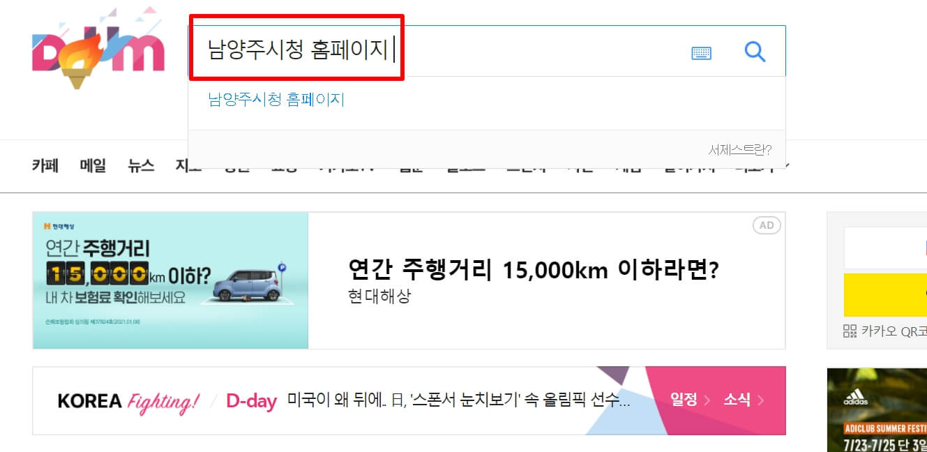 1. 다음(daum) 검색창에 "남양주시청 홈페이지"라고 검색을 합니다.