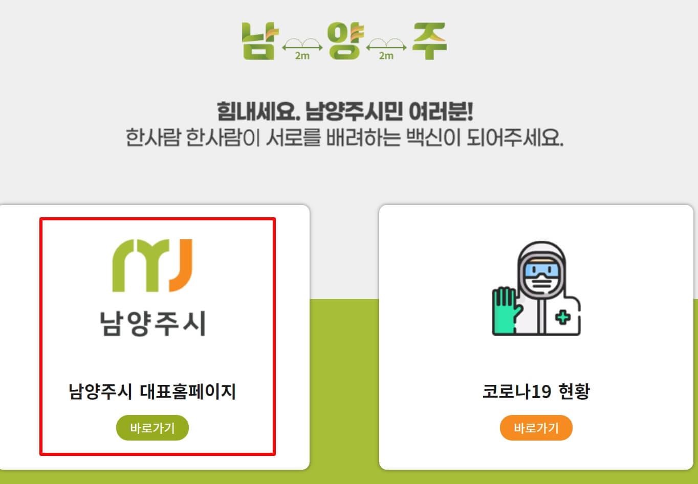 3. 남양주시청을 누르셔서 접속을 하시면 남양주시청 홈페이지에 바로 접속이 되지 않고, "남양주시 홈페이지 바로가기" "코로나19 현황 바로가기" 2군데가 나옵니다. 첫번째인 "남양주시 홈페이지 바로가기"를 누르셔서 남양주시 홈페이지에 접속을 합니다.