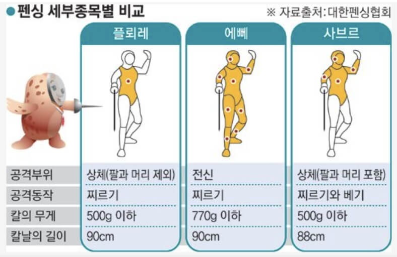 펜싱 플뢰레, 에페, 사브르 차이는 다음과 같습니다.