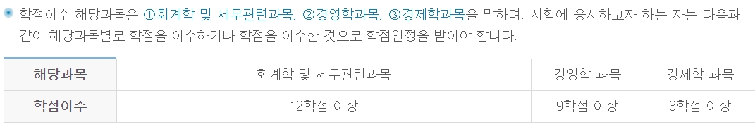 학교 등에서 학점이수 해당 과목별로 회계학 및 세무 관련 과목 12학점 이상, 경영학 과목 9학점 이상, 경제학 과목 3학점 이상을 이수한 자 또는 이수한 것으로 학점인정을 받은 자만이 공인회계사 시험에 응시할 수 있습니다.
