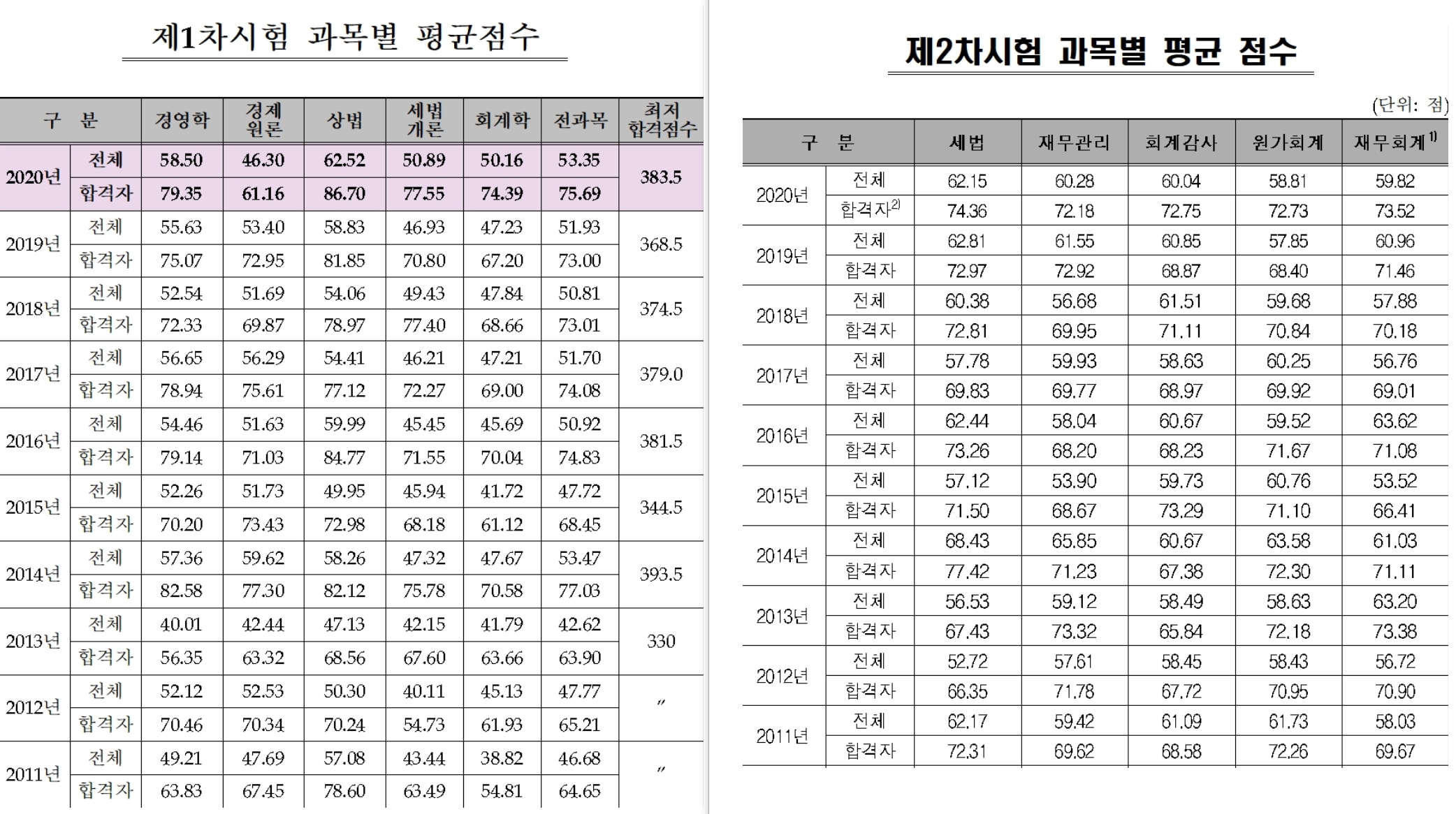 공인회계사 시험 최근 10년간 1.2차 과목별 평균점수입니다.