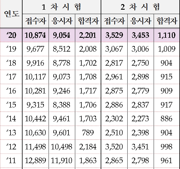공인회계사 시험 최근 10년간 응시자, 합격자 인원입니다.