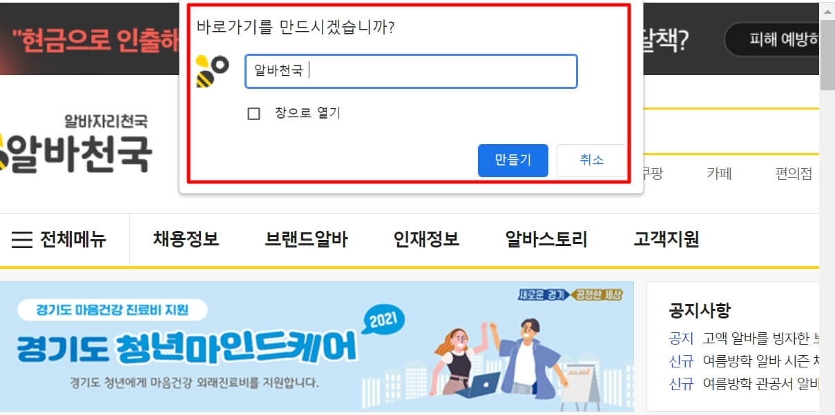 6. 바탕화면에 알바천국 아이콘이 생성됩니다. 아이콘만 누르시면 알바천국 사이트에 접속을 하실 수 있습니다. 그리고 지역별 알바, 청소년 알바, 단기 알바, 급구 알바, 장기 알바 등 상황에 맞는 알바를 손쉽게 구하실 수 있습니다.