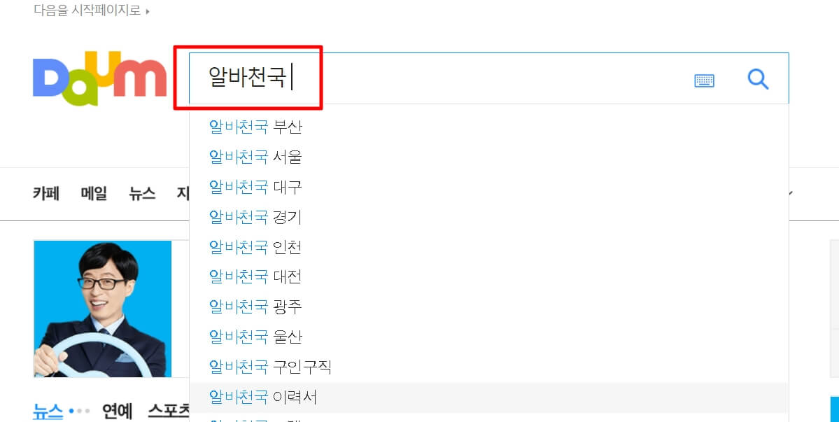 1. 다음(daum) 검색창에 "알바천국 구인구직"이라고 검색을 합니다.