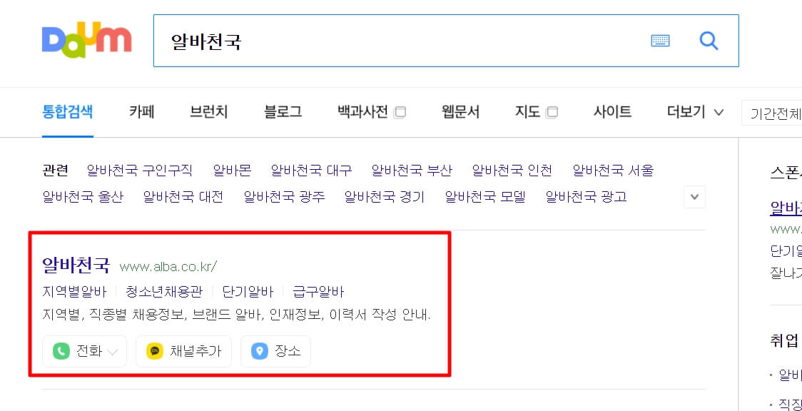 1. 다음(daum) 검색창에 "알바천국 구인구직"이라고 검색을 합니다.