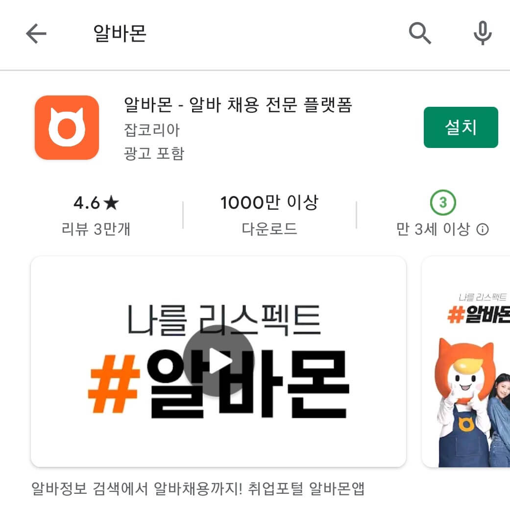 1. 구글 플레이스토어 검색창에 알바몬이라고 검색을 합니다. 그리고 알바몬 모바일 어플을 다운로드(설치) 합니다.