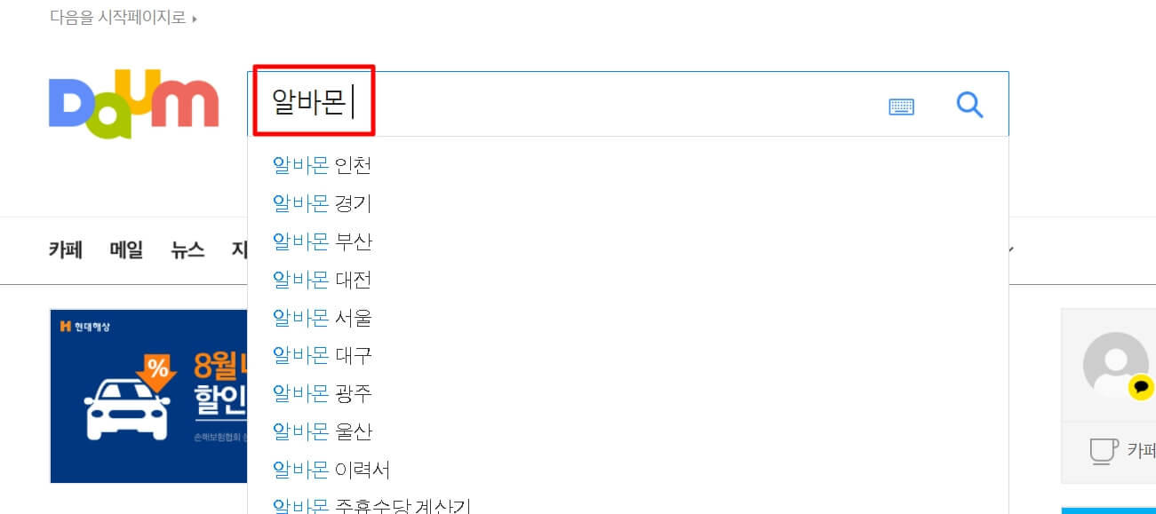 1. 다음(daum) 검색창에 "알바몬 구인구직"이라고 검색을 합니다.
