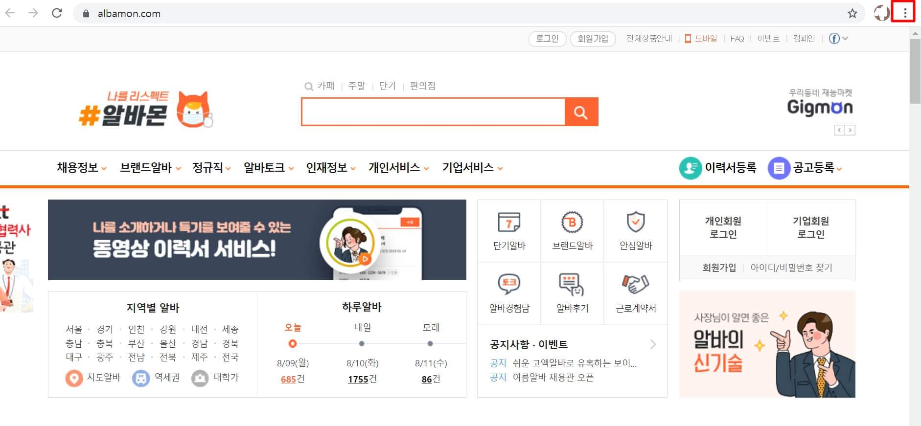 3. 알바몬 사이트에 접속하셔서 오른쪽 상단에 보시면 "점 3개"를 누릅니다.