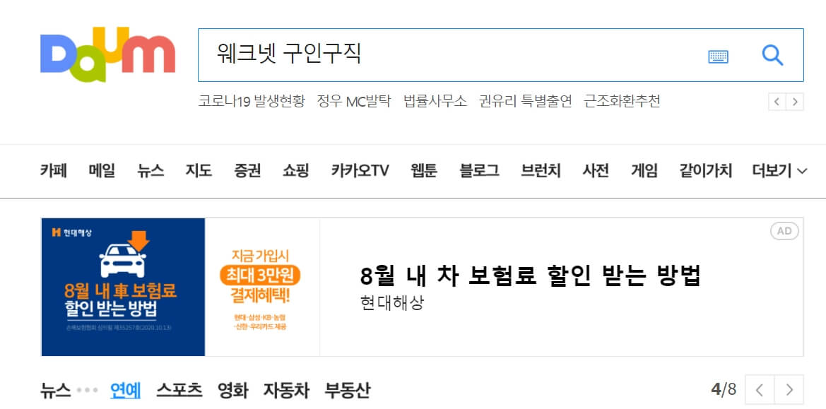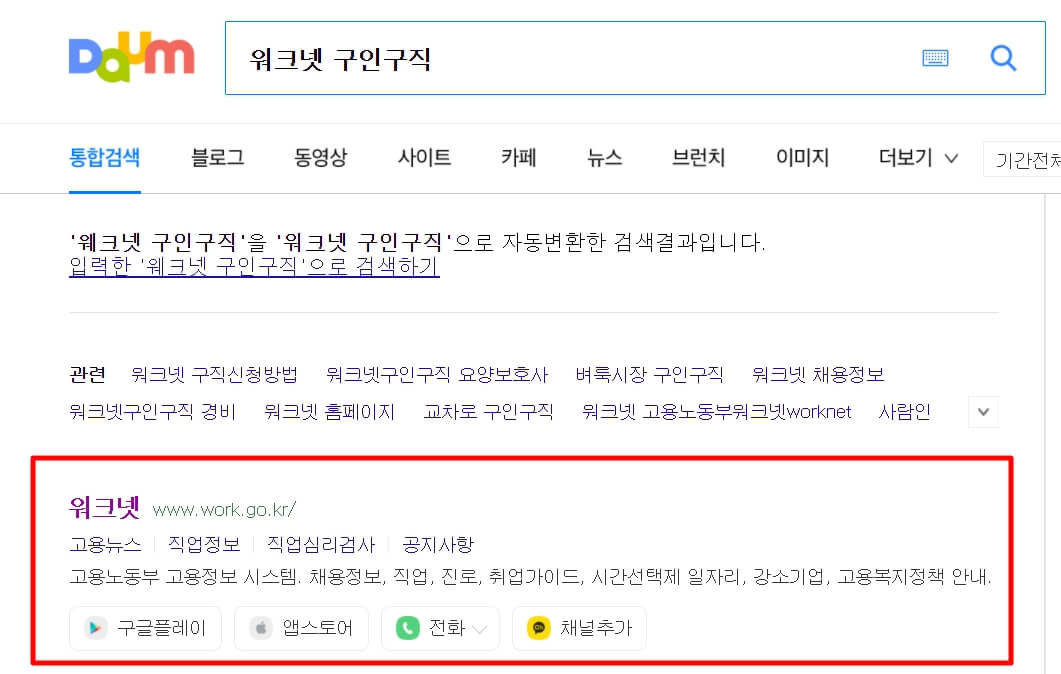 1. 다음(daum) 검색창에 "워크넷 구인구직"이라고 검색을 합니다.