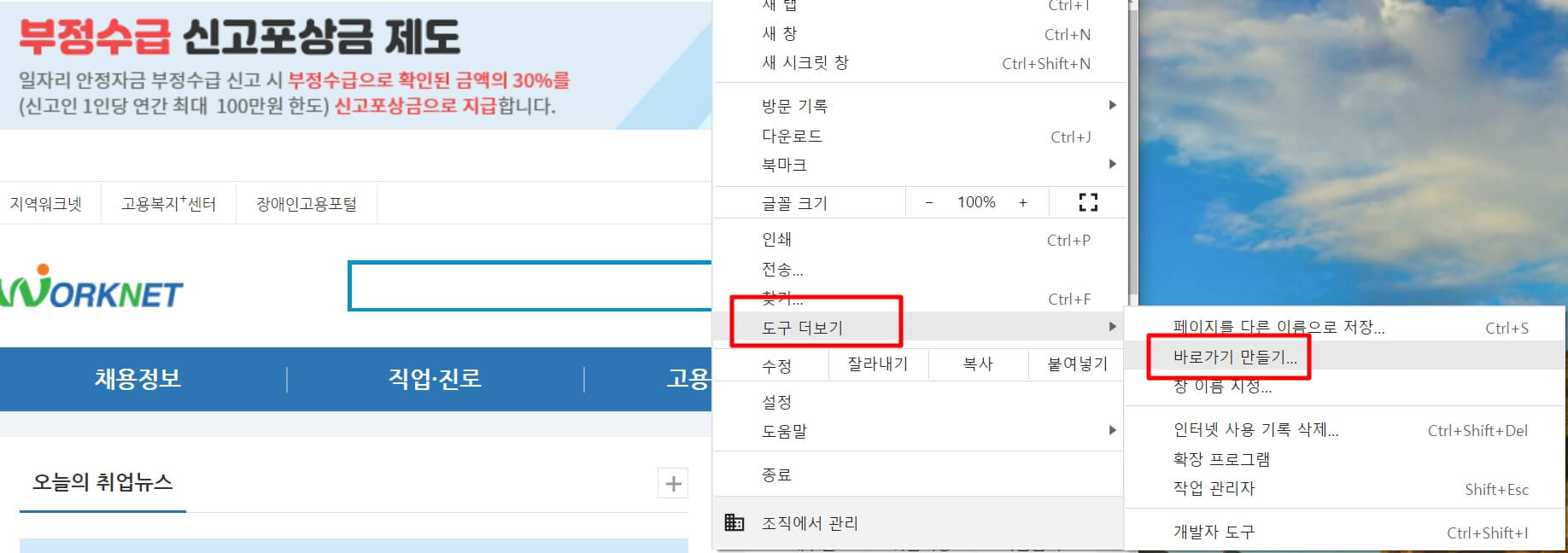 4. "도구 더보기" "바로가기 만들기"를 누릅니다.