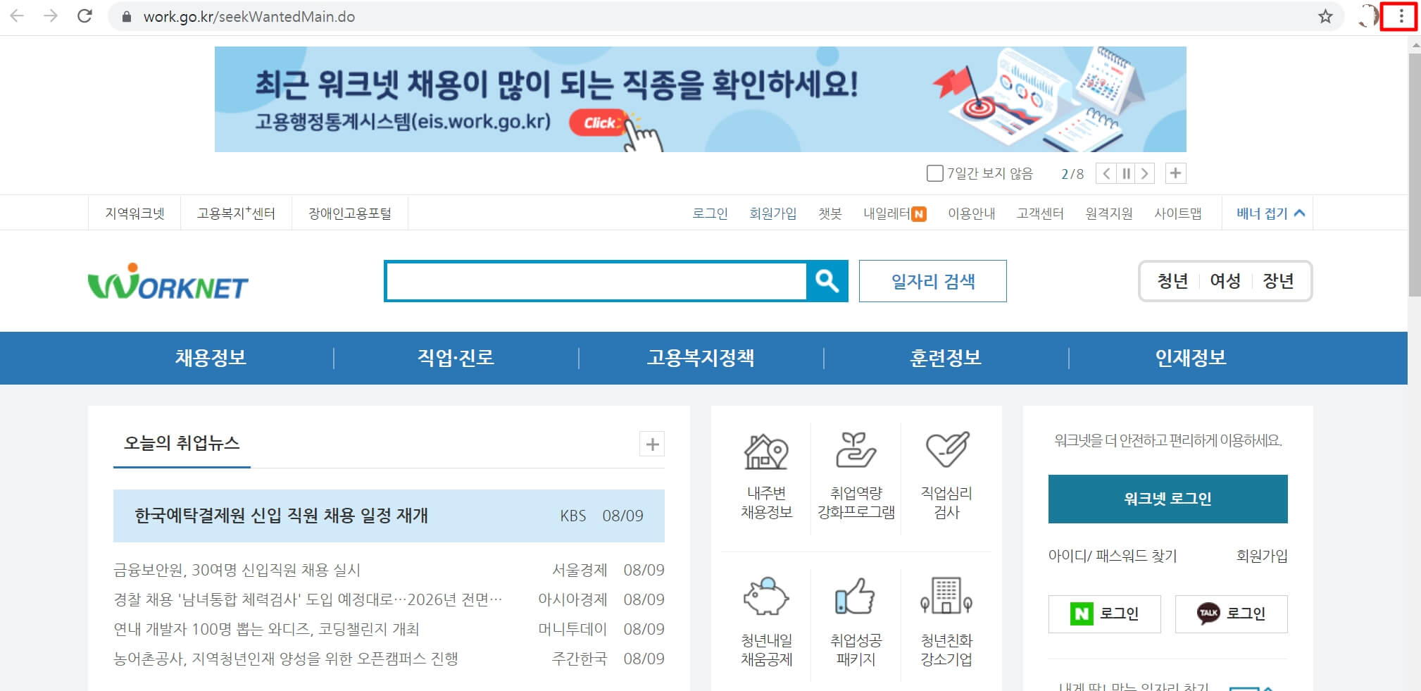 3. 워크넷 사이트에 들어가셔서 오른쪽 상단에 보시면 "점 3개"를 누릅니다.