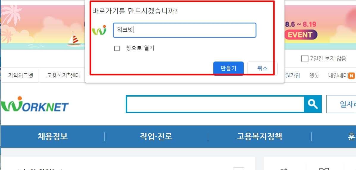 6. 바탕화면에 워크넷 구인구직 아이콘이 생성됩니다. 워크넷 아이콘만 누르시면 바로 사이트에 접속을 하실 수 있습니다. 그리고 채용정보, 직업, 진로, 취업가이드, 시간선택제 일자리 등 일자리 구하는데 많은 도움을 받으실 수 있습니다.