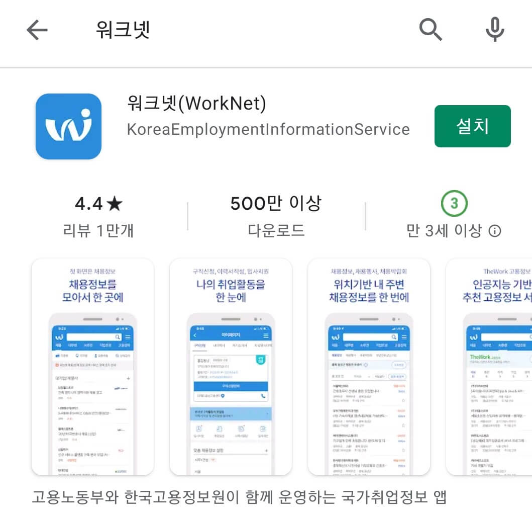 1. 구글 플레이스토어 검색창에서 워크넷을 검색합니다. 그리고 워크넷 어플을 다운로드(설치)를 합니다.