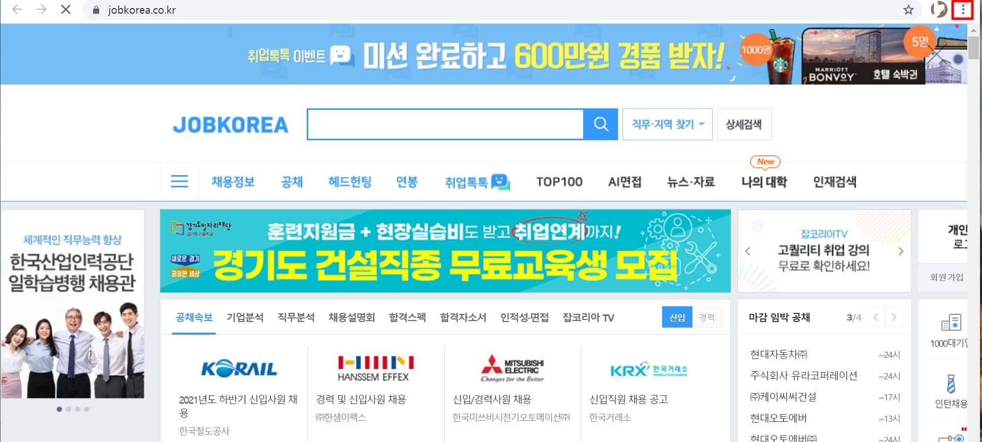 3. 잡코리아 사이트에 들어가셔서 오른쪽 상단에 보시면 "점 3개"를 누릅니다.