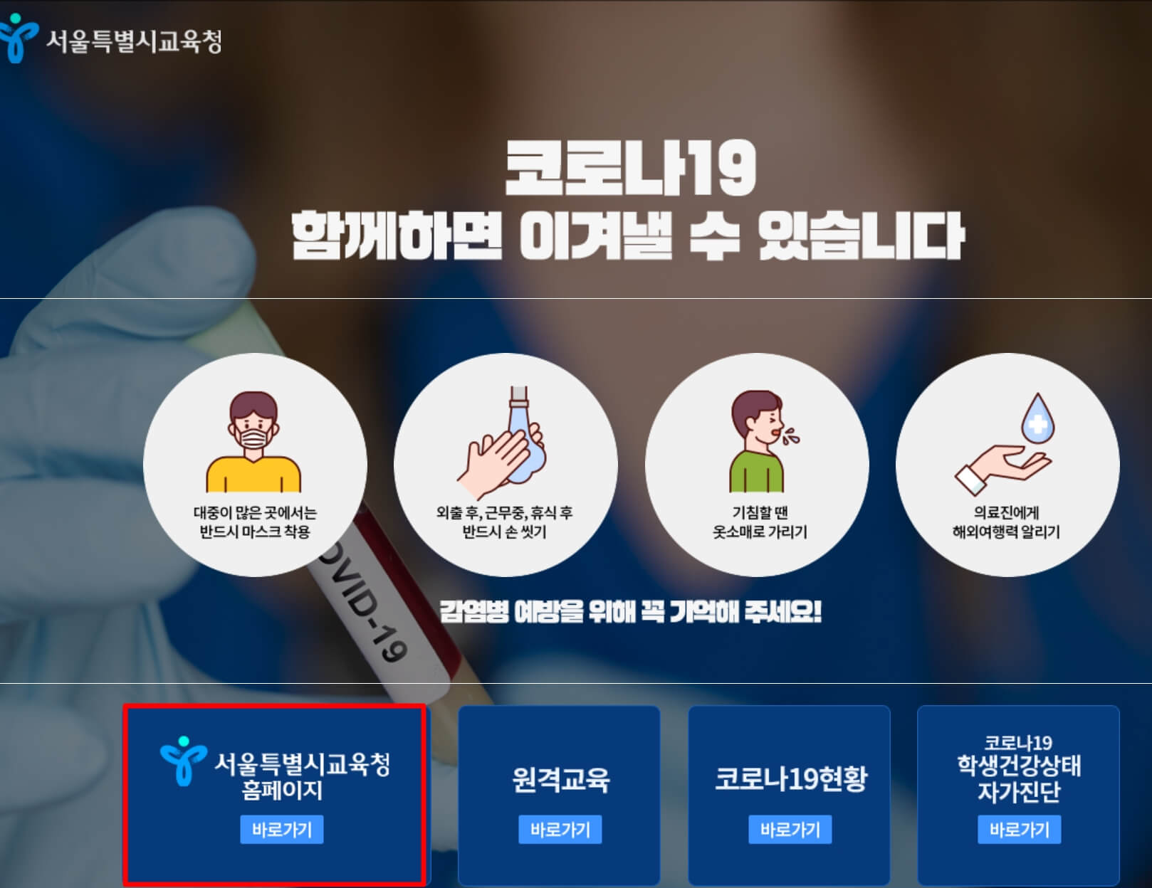 3. 서울시 교육청 홈페이지에 바로 접속하기 전에 "서울시 교육청 홈페이지 바로가기" "원격교육 바로가기" "코로나19 현황 바로가기" "학생 건강상태 자가진단 바로가기" 4곳이 나옵니다. 여기서 제일 첫 번째인 "서울시 교육청 홈페이지 바로가기"를 누르셔서 접속을 합니다.