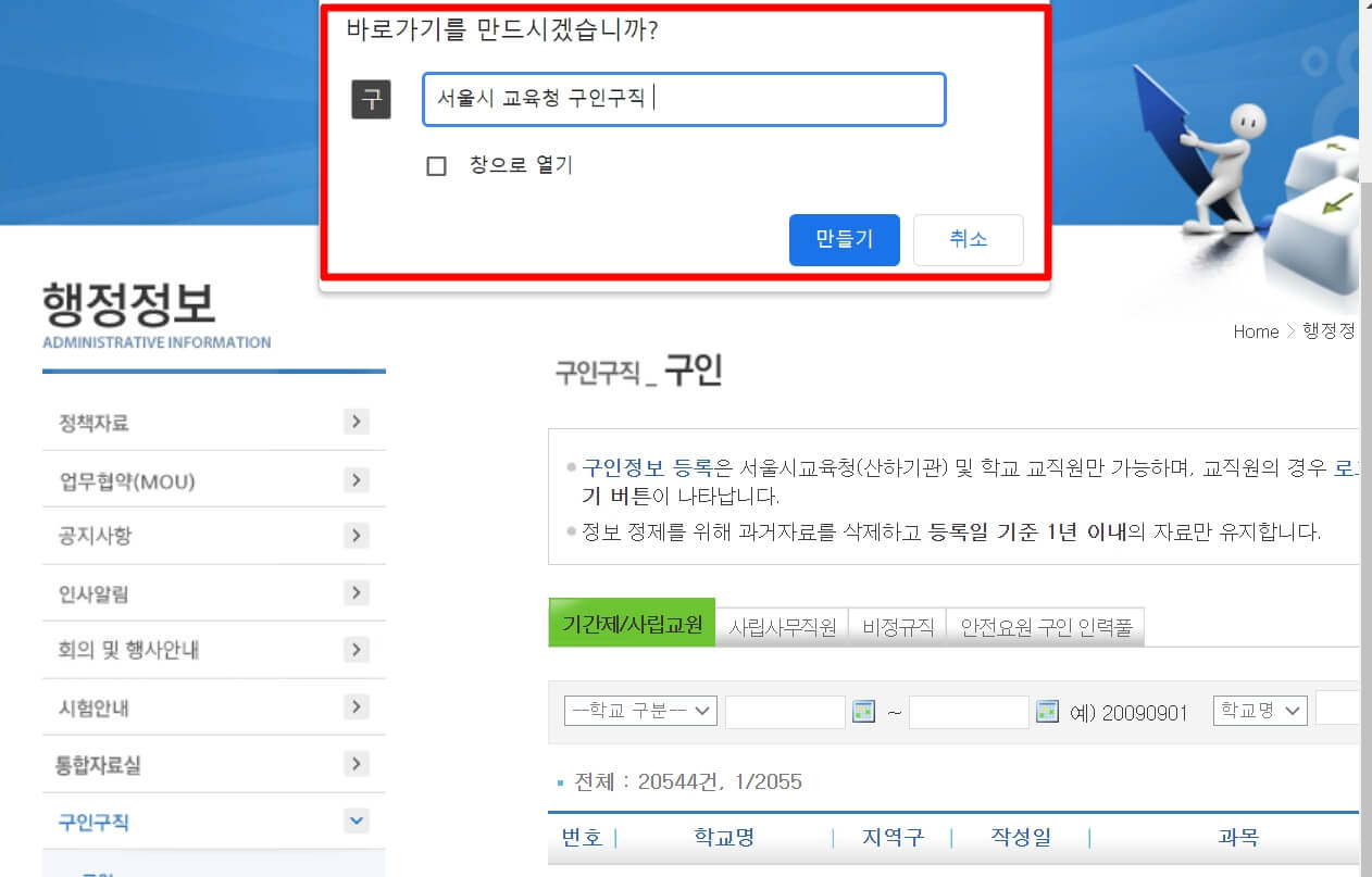 7. "바로가기를 만드시겠습니까"라고 뜨면 원하시는 이름으로 적으시고, 만들기를 누릅니다. 저는 "서울시 교육청 구인구직"으로 해서 만들기를 하였습니다.