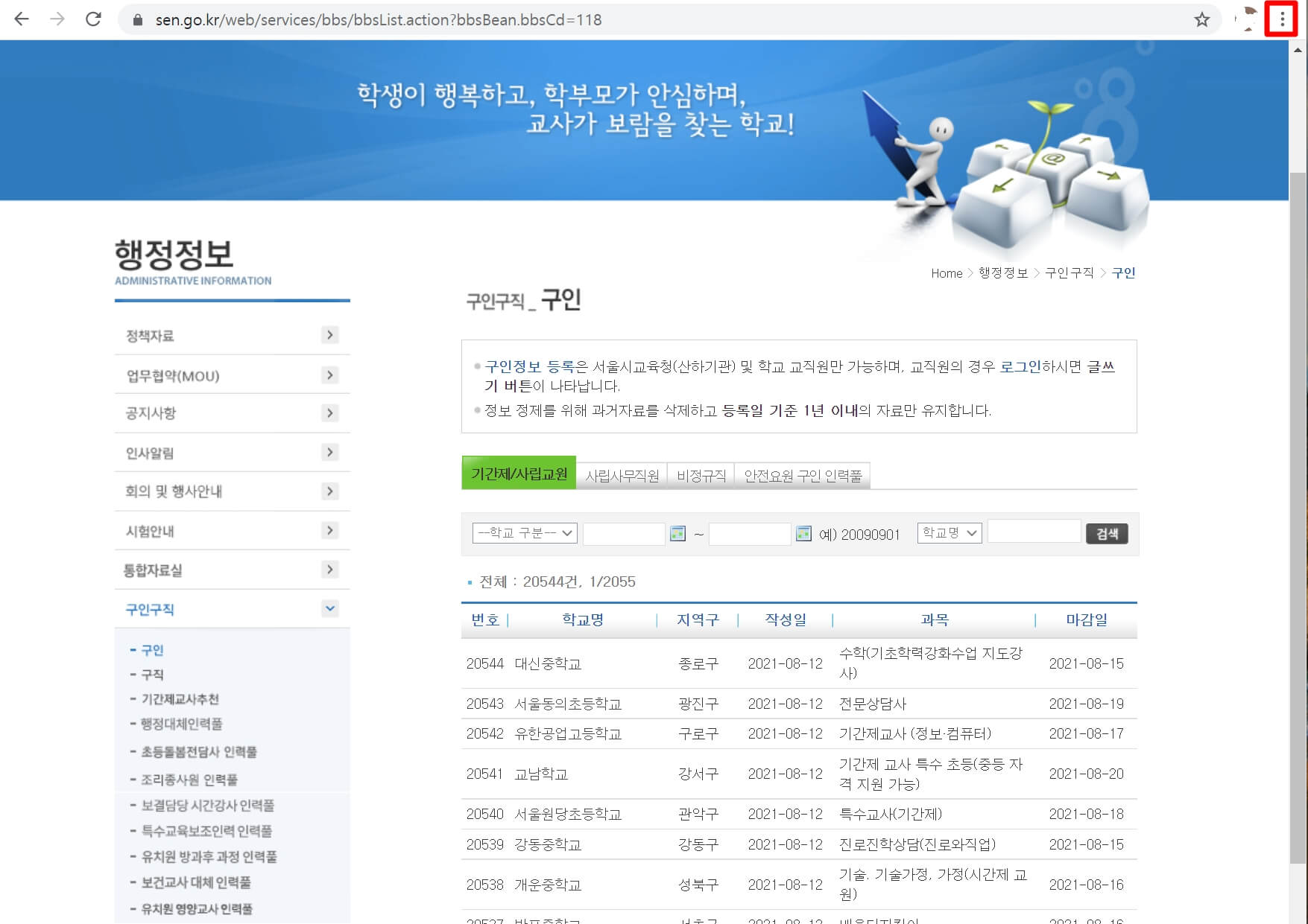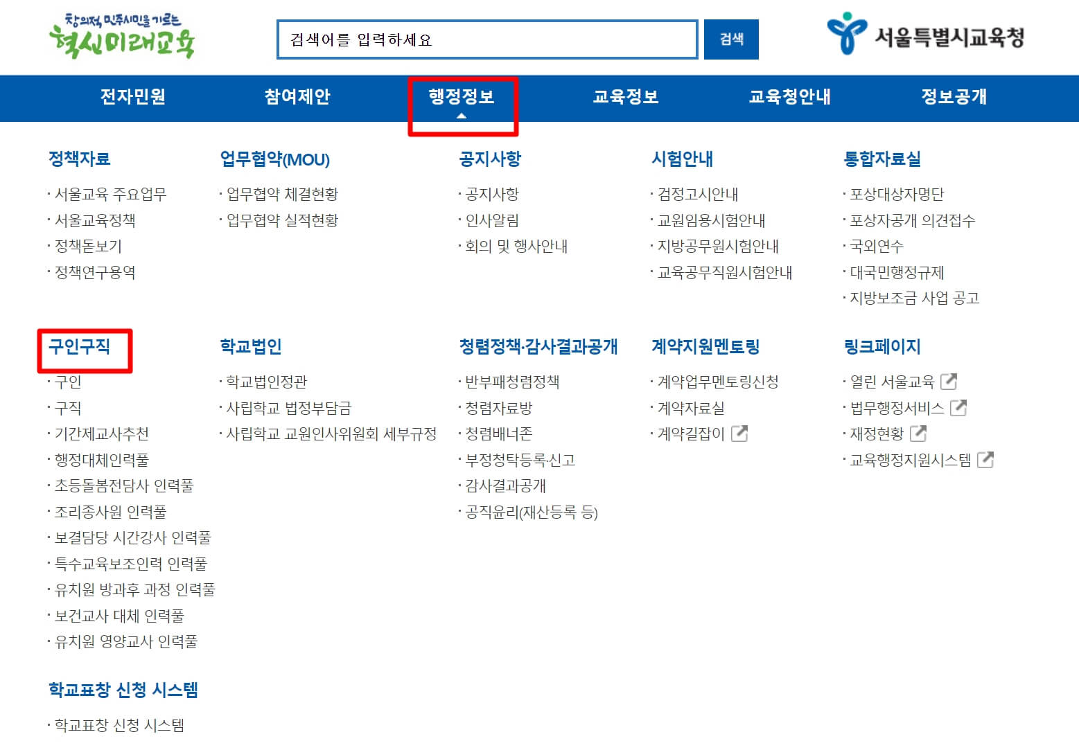 4. 서울시 교육청 홈페이지에 들어가셔서 "행정정보" - "구인구직" 순으로 누르십니다.