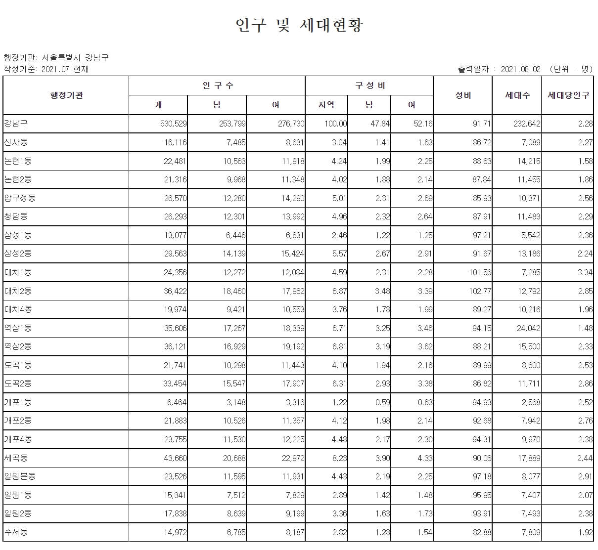 강남구 인구는 전체 53만 0,529명입니다.(21년 7월 기준)
