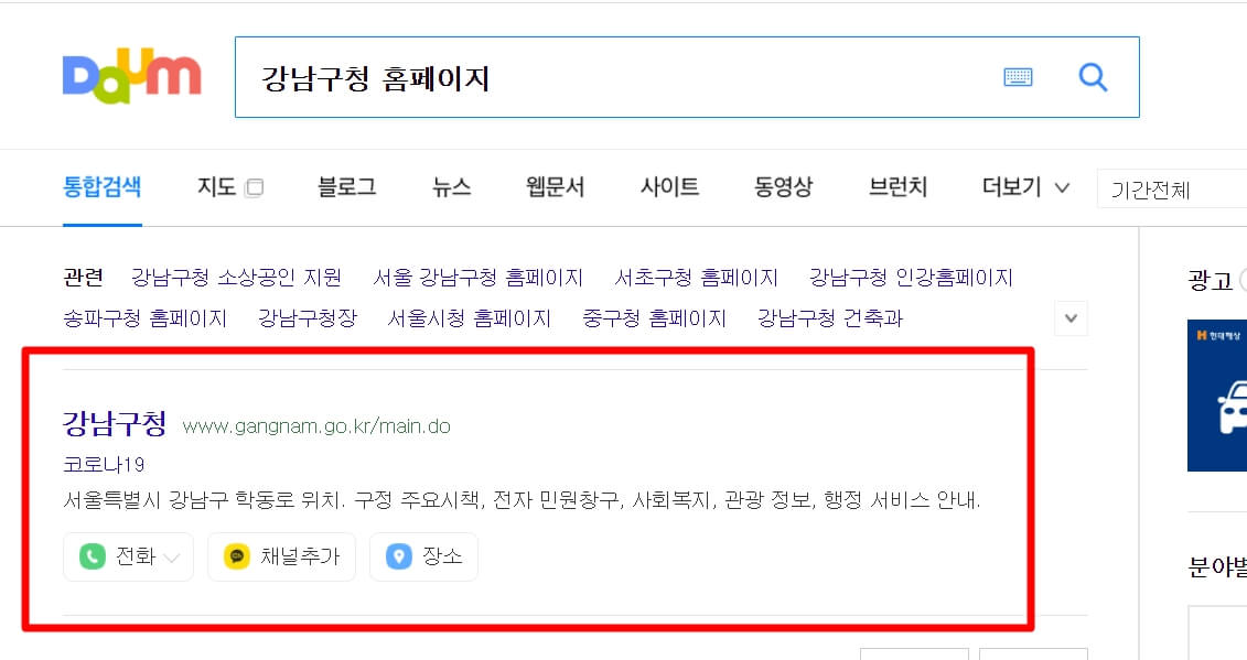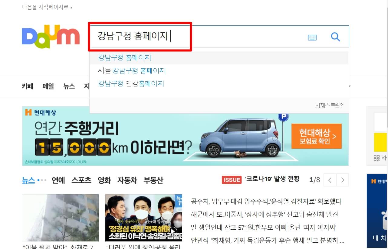 1. 다음(daum) 검색창에 "강남구청 홈페이지"라고 검색을 합니다.