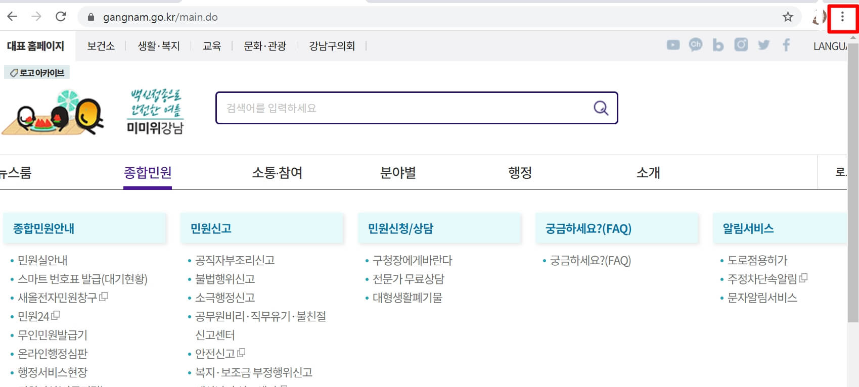 3. 강남구청 홈페이지에 들어가셔서 오른쪽 상단에 보시면 "점 3개"를 누릅니다.