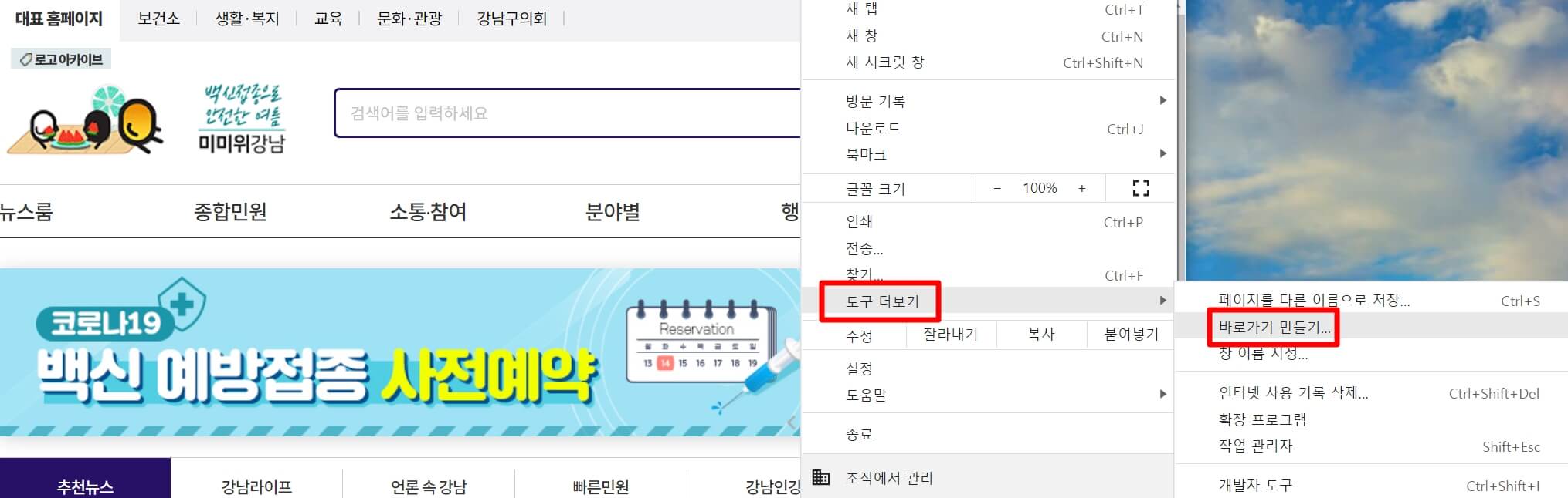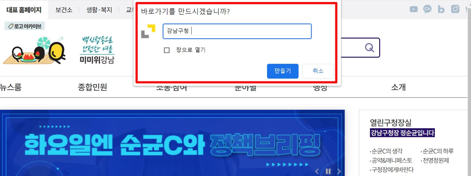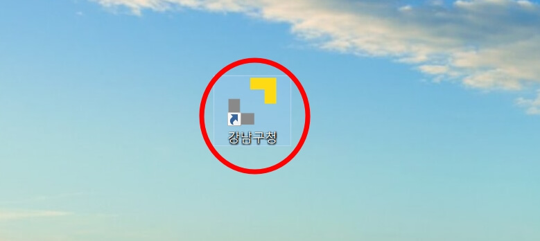 6. 바탕화면에 강남구청 아이콘이 생성이 됩니다. 강남구청 아이콘만 누르시면 강남구청 홈페이지에 바로 접속을 하실 수 있습니다. 그리고 강남구청 구정 주요 시책, 전자 민원창구, 사회복지, 관광 정보, 행정 서비스 등을 이용하실 수 있습니다.
