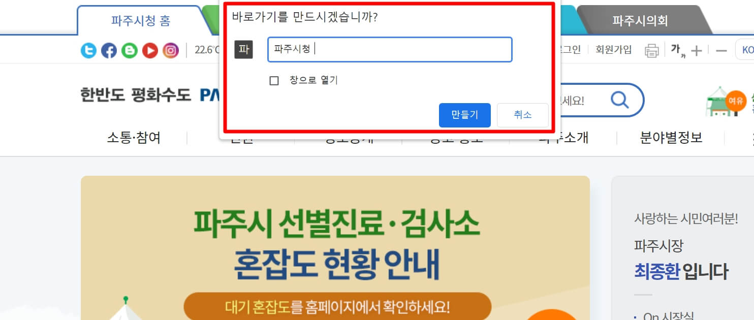 6. 바탕화면에 파주시청 아이콘이 생성이 됩니다. 파주시청 아이콘만 누르시면 파주시청 홈페이지에 바로 접속을 하실 수 있습니다. 그리고 파주시청 시정 주요 시책, 전자 민원창구, 사회복지, 관광 정보, 행정 서비스 등을 이용하실 수 있습니다.