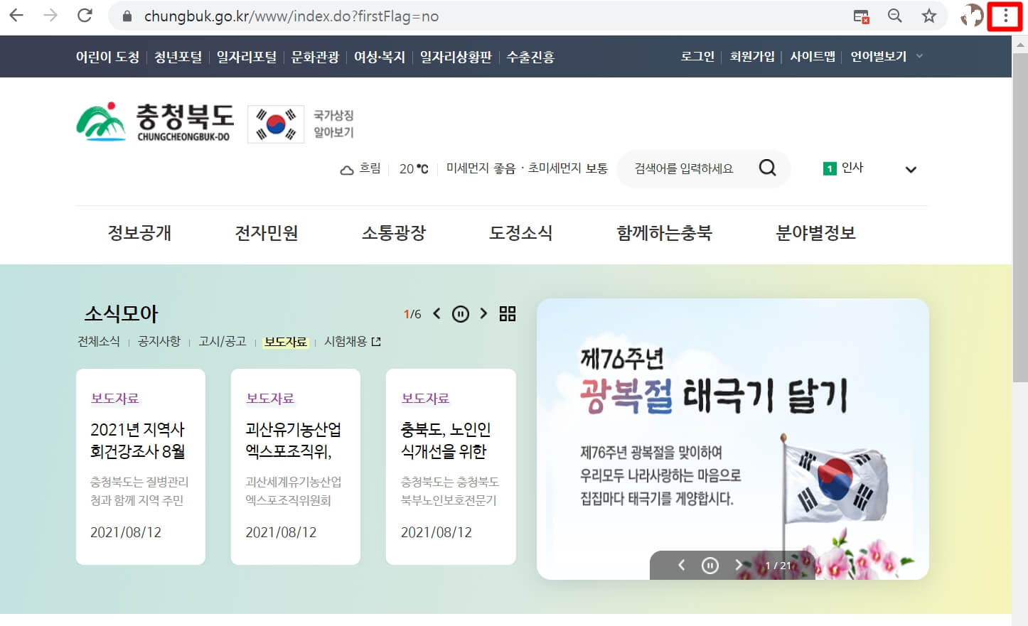 4. 충북도청 홈페이지에 들어가셔서 오른쪽 상단에 보시면 "점 3개"를 누릅니다.