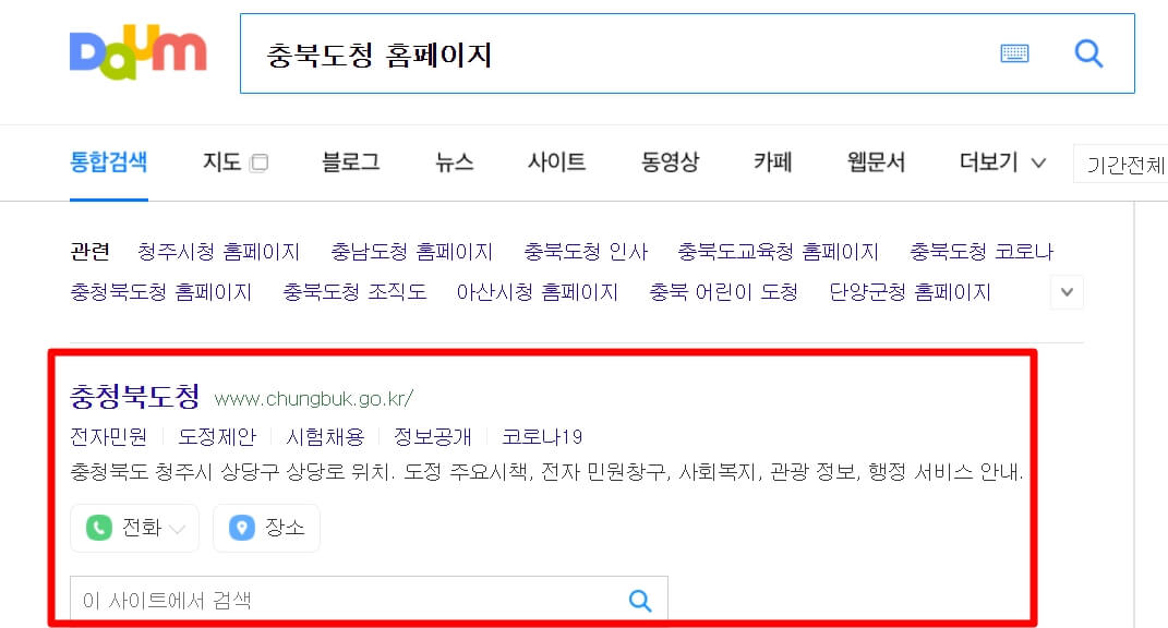 1. 다음(daum) 검색창에 "충북도청 홈페이지"라고 검색을 합니다.