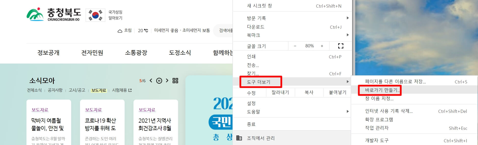 7. 바탕화면에 충북도청 아이콘이 생성이 됩니다. 충북도청 아이콘만 누르시면 충북도청 홈페이지에 바로 접속을 하실 수 있습니다. 그리고 충북도청의 도정 주요 시책, 전자 민원창구, 사회복지, 관광 정보, 행정 서비스 등을 이용하실 수 있습니다.