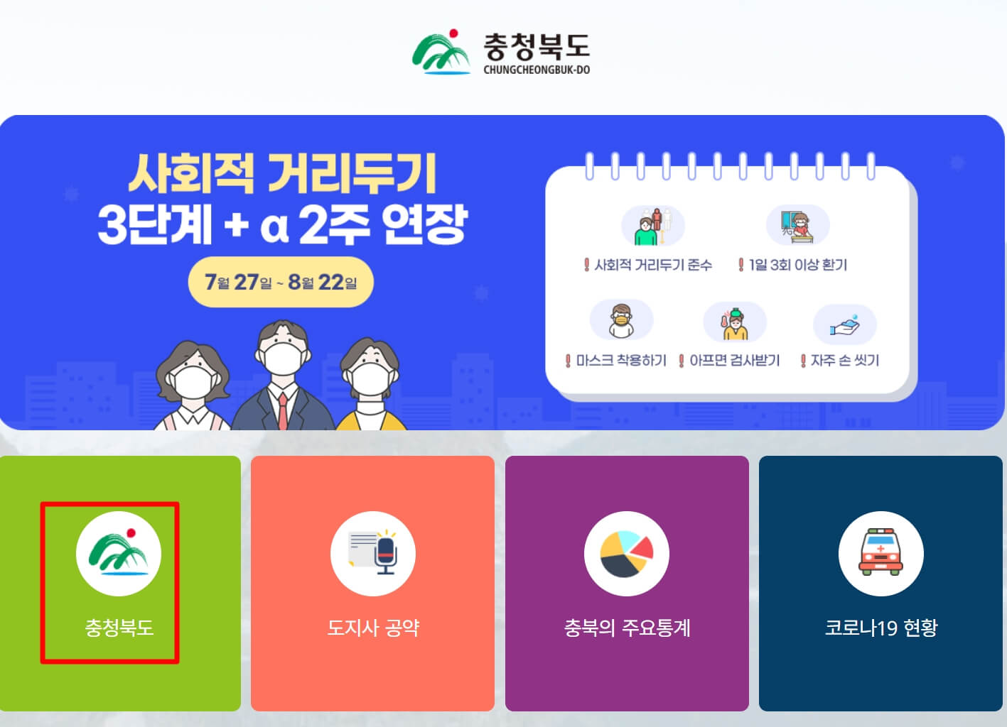 3. 충북도청을 누르셔서 접속을 하시면 충북도청 홈페이지에 바로 접속이 되지 않고, "충청북도" "도지사공약" "충북의 주요 통계" "코로나19 현황" 4군데가 나옵니다. 여기서 첫 번째인 "충청북도"를 누르셔서 접속을 합니다.