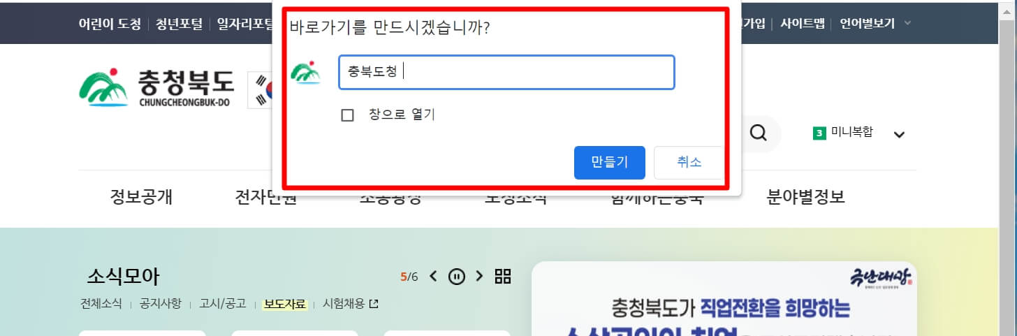 7. 바탕화면에 충북도청 아이콘이 생성이 됩니다. 충북도청 아이콘만 누르시면 충북도청 홈페이지에 바로 접속을 하실 수 있습니다. 그리고 충북도청의 도정 주요 시책, 전자 민원창구, 사회복지, 관광 정보, 행정 서비스 등을 이용하실 수 있습니다.