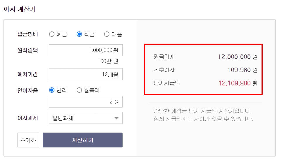 예를 들어 월 적립액 100만원, 예치기간 12개월, 연이자 2%, 일반과세로 계산하여 보겠습니다.