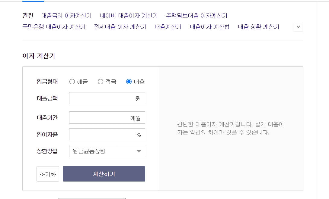 2. 검색을 하시면 아래와 같이 이자 계산기가 나옵니다. 지금부터 예금, 적금, 대출이자 계산기를 이용하여 계산하여 보겠습니다.