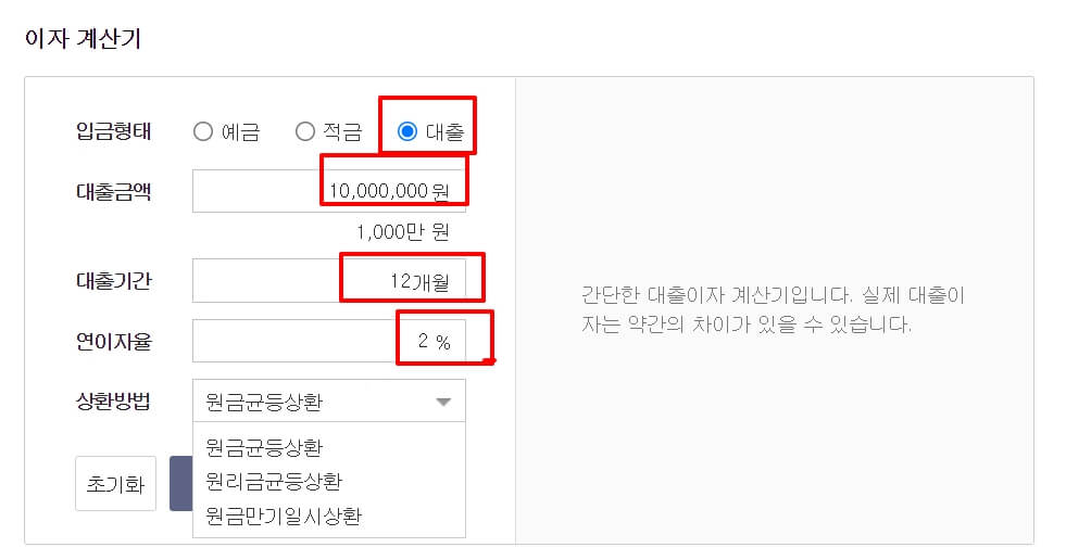 예를 들어 대출금액 1,000만원, 대출기간 12개월, 연이자 2%, 원금균등상환, 원리금균등사환, 원금만기일시상환방식으로 각각 계산해보겠습니다.